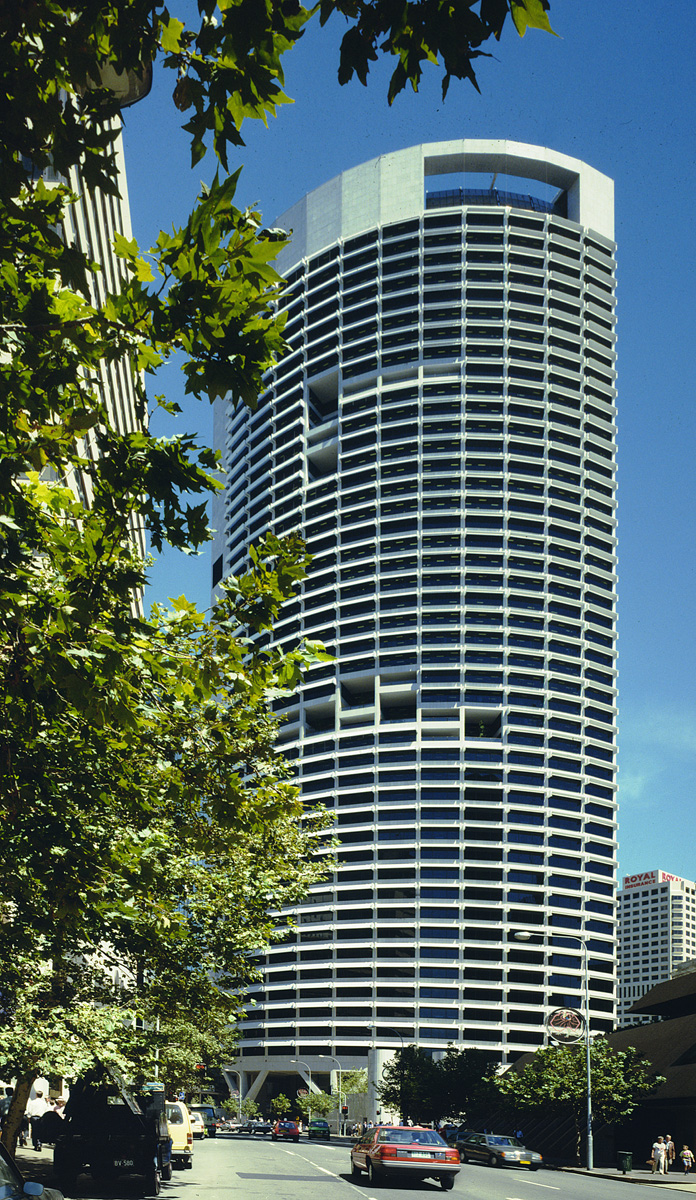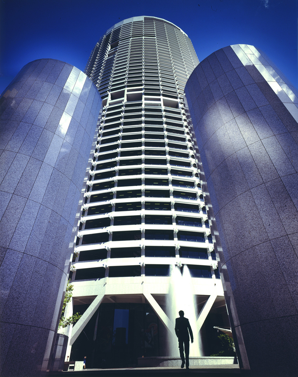The plan form of the 45 storey office tower, is a quadrant and its opposing configuration maximise the sweep of the best views and open space outlook. The shape, based on clear geometry, inherently offers opportunities for a long span, column-free system of floor construction, whereby every structural span and beam are identical. Open plaza-recreation spaces for the thousands of office workers and visitors to the project are provided.